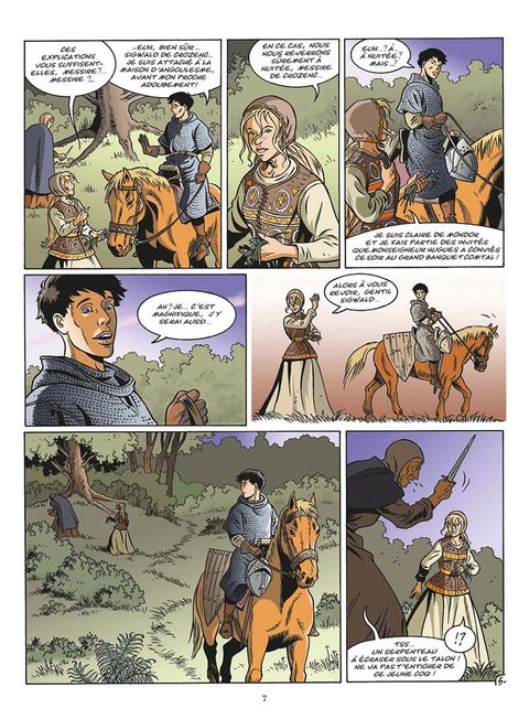 Sigwald de Crozenc, jeune écuyer de la maison de Lusignan, parfait son apprentissage en la ville d'Angoulême. Et pourtant, aux dires même de ses professeurs, l'art des armes ne possède plus de secrets pour lui. Le voilà devenu chevalier accompli et homme comblé, Guérande partageant ses nuits malgré l'interdit qui plane sur leur relation. Cependant, un autre coeur commence à battre à l'approche de l'héritier des Crozenc : les pensées de Claire de Mondor se portent vers lui après leur inattendue première rencontre matinale. Quant à Odilon, il ronge son frein et ne cherche qu'une ouverture pour se venger de celui qu'il rend responsable de la mort de sa soeur. Dès lors, c'est la guerre ouverte entre les deux adolescents. Heureusement, Sigwald peut compter sur son compagnon Raoul, alors que de sombres manigances, qui touchent aux hautes sphères du pouvoir, s'amoncellent au-dessus de la tête de Sigwald de Crozenc et de sa maisonnée... Dans cette période médiévale où toute une société est à redécouvrir, les sentiments, les actions et les rebondissements sont menés tambour battant. Intrigues et complots sont servis par une superbe reconstitution historique.