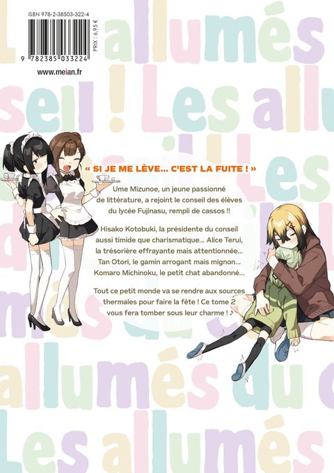 Explosion de mignonnerie garantie !!" Si je me lève... c'est la fuite ! "Ume Mizunoe, un jeune passionné de littérature, a rejoint le conseil des élèves du lycée Fujinasu, rempli de cassos !! Hisako Kotobuki, la présidente du conseil aussi timide que charismatique... Alice Terui,la trésorière effrayante mais attentionnée...Tan Otori, le gamin arrogant mais mignon...Komaro Michinoku, le petit chat abandonné... Tout ce petit monde va se rendre aux sources thermales pour faire la fête ! Ce tome 2 vous fera tomber sous leur charme !La comédie déjantée, mignonne et coquine du conseil des élèves !!
