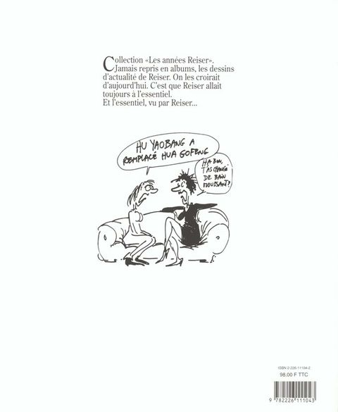 Collection ""Les années Reiser"". Jamais repris en albums, les dessins d'actualité de Reiser. On les croirait d'aujourd'hui. C'est que Reiser allait toujours à l'essentiel. Et l'essentiel, vu par Reiser..