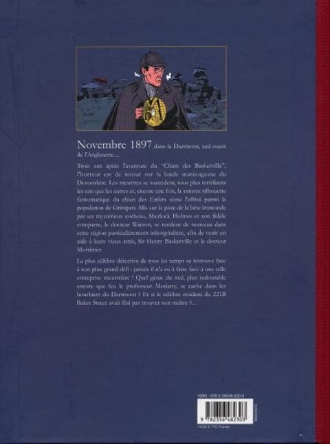 Novembre 1897 dans le Dartmoor, sud-ouest de l'Angleterre. Trois ans après l'aventure du Chien des Baskerville, l'horreur est de retour sur la lande marécageuse du Devonshire. Les meurtres se succèdent, tous plus terrifiants les uns que les autres et, encore une fois, la sinistre silhouette fantomatique du chien des Enfers sème l'effroi parmi la population de Grimpen. Mis sur la piste de la bête immonde par un mystérieux corbeau, Sherlock Holmes et son fidèle comparse, le docteur Watson, se rendent de nouveau dans cette région particulièrement inhospitalière, afin de venir en aide à leurs vieux amis, Sir Henry Baskerville et le docteur Mortimer. Le plus célèbre détective de tous les temps se retrouve face à son plus grand défi : jamais il n'a eu à faire face a une telle entreprise meurtrière ! Quel génie du mal, plus redoutable encore que feu Professeur Moriarty, se cache dans les bourbiers du Dartmoor ? Et si le célèbre résident du 221B Baker Street avait fini par trouver son maître ?...