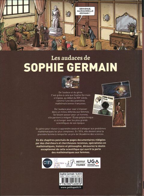 De l’audace et du génie, il n’en faudra pas moins pour que Sophie Germain s’impose, au cours du XVIIIe siècle, comme l’une des premières mathématiciennes françaises. Audacieuse, elle l’est, pour oser s’imposer dans un milieu défendu aux femmes. Se faisant passer pour un homme, elle parvient à intégrer l’école polytechnique. Si brillante, qu’en 1816, elle est la première femme à remporter un prix de l’Académie des sciences. Découvrez en Docu-BD, le destin exceptionnel de Sophie Germain, LA scientifique qui ouvrit la porte des mathématiques aux femmes.