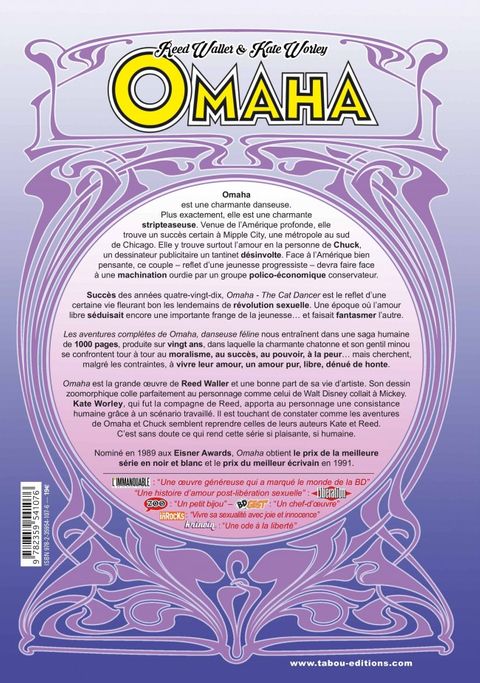 Créée par Reed Waller (dessin) à la fin des années 70, et rejoint très vite par Kate Worley (scénario) au début des années 80, Omaha est la BD anthropomorphique la plus connue et la plus talentueuse. Inspirée de Fritz le chat (1965) et transposée au monde des années 70-80, Omaha, danseuse féline est une BD en feuilletons sur près de 1000 pages qui racontent les aventures sentimentales de Omaha, une danseuse nue, et de Chuck, l'héritier d'un dandy million - naire, pris dans une machination politico-morale. Loin des clichés pornographiques, elle met en scène la vie d'un groupe d'amis et inclut des scènes érotiques qui, bien qu'empreintes de respect et d'affection, ont choqué la morale puritaine de l'époque, faisant de cette bande dessi - née le symbole d'une lutte contre la censure puritaine. Éditée dans un format «bibliothèque» (17 x 24 cartonné) en 4 volumes de 256 pages, cette série mythique offre aux amateurs de bande dessinée l'accès en français à l'intégralité des aventures de Omaha et de ses amis, si délicieusement humains. Nominée en 1989 aux Eisner Awards au titre de la meilleure série, de la meilleure série en noir et blanc, et du meilleur auteur, Omaha obtient le prix de la meilleure série en noir et blanc et du meilleur écrivain en 1991.