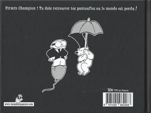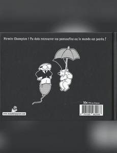 Firmin Champion a perdu ses pantoufles. Le monde n'a jamais été autant en danger ! Suivez Firmin Champion, anti-héros par excellence, qui se retrouve embarqué, bien malgré lui, dans tout un tas d'aventures à l'humour absurde et décalé.Une belette qui parle, un chat fantôme, une fée aux seins nus... Voici seulement quelques-uns des personnages loufoques qui croiseront la route de Firmin dans cette bande dessinée qui ne laisse pas un instant de répit et vous rappellera les doux cartoons de votre enfance avec une légère dose de LSD.