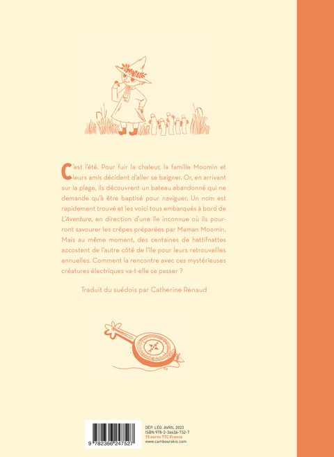 C'est l'été. Pour fuir la chaleur, la famille Moomin et leurs amis décident d'aller se baigner. Or, en arrivant sur la plage, ils découvrent un bateau abandonné qui ne demande qu'à être baptisé pour naviguer. Un nom est rapidement trouvé et les voici tous embarqués à bord de L'Aventure, en direction d'une île inconnue où ils pourront savourer les crêpes préparées par Maman Moomin. Mais au même moment, des centaines de hattifnattes accostent de l'autre côté de l'île pour leurs retrouvailles annuelles. Comment la rencontre avec ces mystérieuses créatures électriques va-t-elle se passer ?