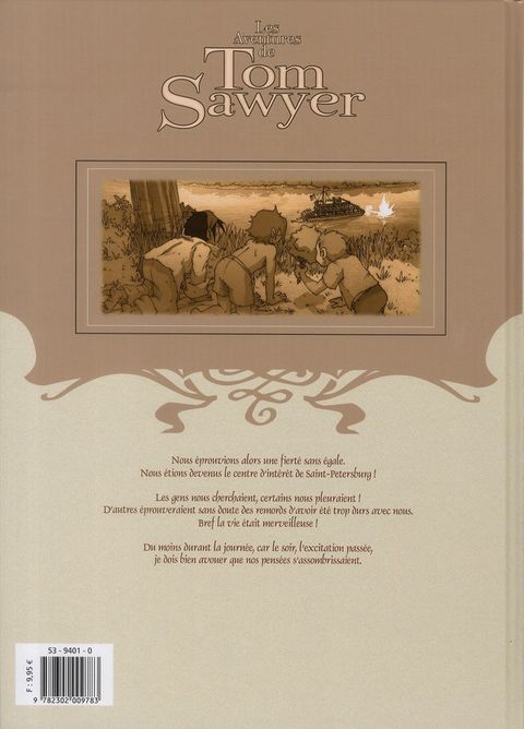 Je m'appelle Tom, Tom Sawyer et la ville de mon enfance est une ville de Louisiane située sur les berges du Mississipi avec ses grands bateaux à vapeur. La maison où je vis, c'est la maison de tante Polly qui s'occupe de nous depuis la mort de maman. Tante Polly est souvent d'humeur féroce après moi. Il faut dire que j'aime faire l'école buissonnière et jouer avec mes amis... Mes amis sont Joe, Ben et Huck. On fait plein de choses ensemble, on joue à Robin des bois et aux Cow-boys et on adore les pirates !