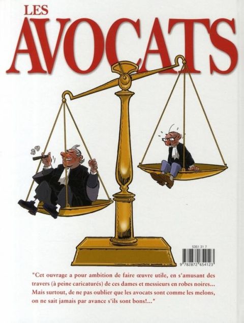Ce superbe album est tout particulièrement dédié aux malheureux justiciables qui ont, ou auront un triste jour, affaire aux auxiliaires de justice que sont les avocats... Cet ouvrage a pour ambition de faire oeuvre utile, en s'amusant des travers (à peine caricaturés) de ces dames et messieurs en robes noires... Mais surtout, de ne pas oublier que les avocats sont comme les melons, on ne sait jamais par avance s'ils sont bons!...