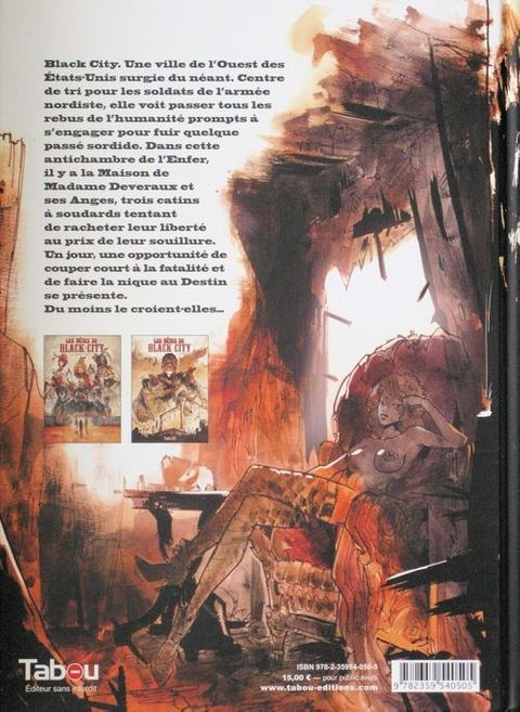 Black City. Une ville de l'Ouest des États-Unis surgie du néant. Centre de tri pour les soldats de l'armeìe nordistes, elle voit passer tous les rebus de l'humanité prompts à s'engager pour fuir quelque passé sordide. Dans cette antichambre de l'Enfer, il y a la Maison de Madame Deveraux et ses Anges de Black City, trois catins à soudards tentant de racheter leur liberté au prix de leur souillure. Un jour, une opportunité de couper cours à la fatalité et de faire la nique au Destin se présente : en collaborant à l'attaque de la diligence transportant la paye de l'armée, elles seront plus riches qu'en 150 ans de passes. Leur rôle ? Retenir par leurs charmes les convoyeurs. Facile pour les Anges. Mais c'était sans compter sur le caractère violent et vicieux des convoyeurs... Histoire sombre d'un Ouest sauvage où la vie n'a pas de valeur et où chaque instant est une épreuve de survie. Cette bédé, prévue en 3 volumes, renoue avec les styles des westerns spaghetti et crépusculaires.