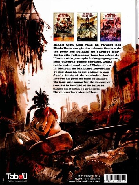 Histoire sombre d'un Ouest sauvage où la vie n'a pas de valeur et où chaque instant est une épreuve de survie, ce troisième volume (après La chute des anges et Le poids des chaînes), clôt ce western spaghetti crépusculaire. Résumé de la série : Black City. Une ville de l'Ouest des États-Unis surgie du néant. Centre de tri pour les soldats de l'armée nordiste, elle voit passer tous les rebus de l'humanité prompts à s'engager pour fuir quelque passé sordide. Dans cette antichambre de l'Enfer, il y a la Maison de Madame Deveraux et ses Anges, trois catins à soudards tentant de racheter leur liberté au prix de leur souillure. Un jour, une opportunité de couper court à la fatalité et de faire la nique au Destin se présente. Du moins le croient-elles.