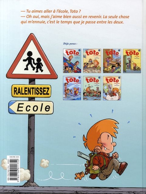 LA SÉRIE Zéro plus zéro égal... la tête à Toto! Le personnage le plus célèbre des cours de récréation possède enfin un visage et devient une star de la bande dessinée! À l'école ou à la maison, Toto n'a de cesse de faire tourner en bourrique son entourage par ses facéties et ses questions naïves: «Dis papa, pourquoi les oiseaux volent?», «Pourquoi le lait de la vache est blanc, alors que l'herbe est verte?». Ses parents, sa maîtresse, Mme Jolibois, son «bon-papa», passionné de jardinage, et une bande de copains espiègles, partagent avec lui des tranches de vie et de rire ... Une galerie de personnages attachants que l'on prendra plaisir à retrouver au fil des albums. RÉSUMÉ DE L'ÉPISODE lls sont tous de retour ! L'instit', la prof de gym, les copains et la famille au grand complet pour une nouvelle année scolaire aux côtés de l'incorrigible Toto. Des nouveaux arrivent aussi : vous ferez la connaissance de l'oncle de Béthune et de l'inspecteur des écoles. L'emploi du temps sera riche en gags, surtout en cette période de fêtes... Eh oui, Toto prépare activement Noël !