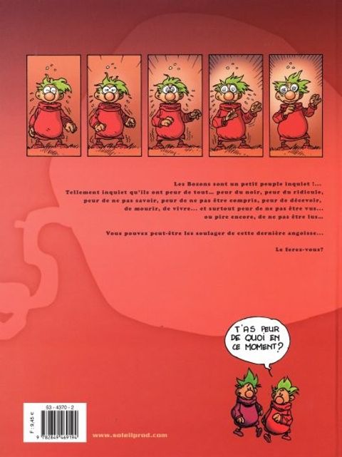 Les bozons sont un petit peuple inquiet !. Tellement inquiet qu'ils ont peur de tout. peur du noir, peur du ridicule, peur de ne pas savoir, peur de ne pas être compris, peur de décevoir, de mourir, de vivre. et surtout peur de ne pas être vus. ou pire encore, de ne pas être lus. vous pouvez peut-être les soulager de cette dernière angoisse. le ferez-vous ?.