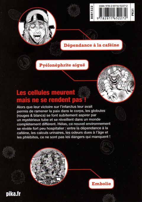 Alors que leur victoire sur l’infarctus leur avait permis de ramener la paix dans le corps, les hématies se font subitement aspirer par un mystérieux tube et se réveillent dans un monde complètement différent. Hélas, ce nouvel environnement se révèle fort peu hospitalier : entre la dépendance à la caféine, les calculs urinaires, les odeurs dues à l’âge et les phlébites, ce ne sont pas les dangers qui manquent !