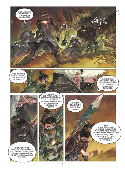 À la recherche de la pierre aux cinq couleurs.Depuis des siècles, les brumes écarlates ne sèment que mort et destruction sur la Terre. Aucun homme n’a réussi à se débarrasser de ce monstrueux fléau que l'on prétend issu des dieux. Même si certaines troupes d'élite ont depuis appris à les connaître et à les combattre... en vain. Mais il se pourrait bien qu'un artefact nommé la "pierre aux cinq couleurs" puisse changer la donne. Car selon la légende, celui qui détiendrait la pierre serait en mesure de contrôler la puissance de ces brumes surnaturelles et de régner sur le monde ! Qui de Wuding, le fossoyeur de dieux et son groupe de rebelles, Di Shu, son excentrique rival, ou des puissances des royaumes de Tieliu, Qingqiu ou Danzhu parviendra à mettre la main dessus ? Et dans l'ombre, qu'est-ce que manigancent les mystérieuses forces à l'origine de cette chasse à la pierre ?Récit de fantasy inspiré du folklore chinois, Les Brumes Écarlates est porté par un dessin virtuose, fourmillant, précis et expressif qui s’embellit d’incroyables ambiances colorées et chatoyantes. Un deuxième volume qui vient préciser et enrichir l'univers complexe et foisonnant de cette saga d’aventures époustouflante où s’affrontent des héros épiques aux design et personnalités hors du commun.