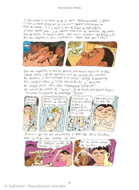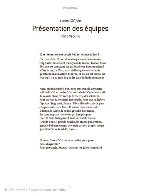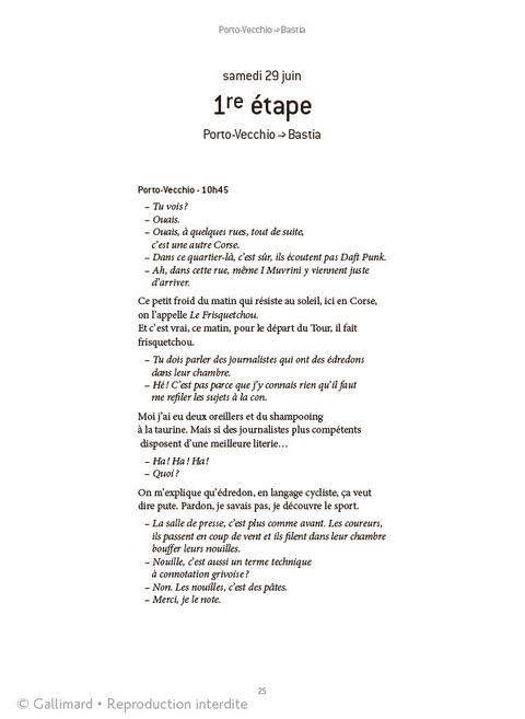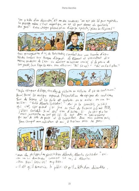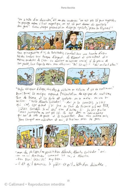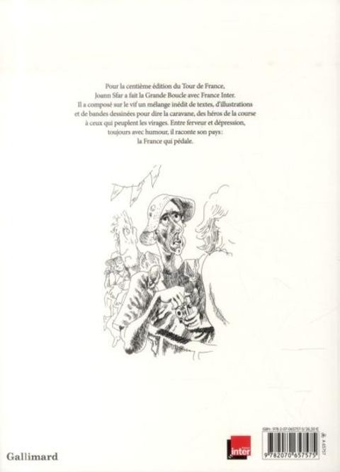 Pour la centième édition du Tour de France, Joann Sfar s'est fait chroniqueur radio et a partagé pendant 21 jours la vie de la caravane. Dans une France au bord de l'implosion, il a enfourché son crayon pour nous faire vivre de l'intérieur toutes les étapes du tour. Entre le journal intime et la dramatique radio, il parle du pays - la France n'est-elle pas plus jolie quand on ne la regarde pas depuis Paris ? On prend l'air, on pédale, et qui sait, c'est peut-être la machine à penser qui va se remettre à fonctionner.