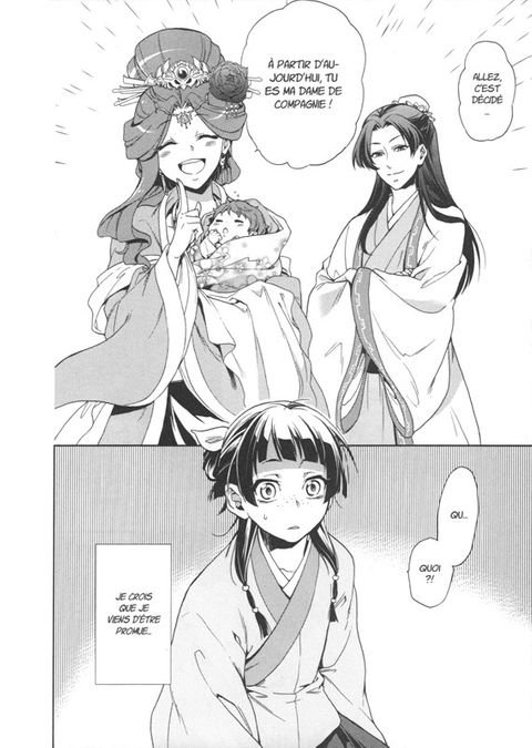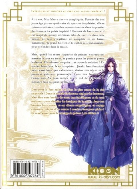 Intrigues et poisons au coeur du palais impérial ! A 17 ans, Mao Mao a une vie compliquée. Formée dès son jeune âge par un apothicaire du quartier des plaisirs, elle se retrouve enlevée et vendue comme servante dans le quartier des femmes du palais impérial ! Entouré de hauts murs, il est coupé du monde extérieur. Afin de survivre dans cette prison de luxe grouillant de complots et de basses manoeuvres, la jeune fille tente de cacher ses connaissances pour se fondre dans la masse. Mais, quand les morts suspectes de princes nouveau-nés mettent la cour en émoi, sa passion pour les poisons prend le dessus. Elle observe, enquête... et trouve la solution ! En voulant bien faire, la voilà repérée... Jinshi, haut fonctionnaire aussi beau que calculateur, devine son talent et la promeut goûteuse personnelle d'une des favorites de l'empereur. Au beau milieu de ce nid de serpents, le moindre faux pas peut lui être fatal ! Découvrez la face cachée du lieu le plus secret de la cité impériale ! Dans ce monde de femmes régi par les hommes, Mao Mao aura besoin de toute son intelligence et de tout son savoir pour démêler les intrigues de la cour... Avec son héroïne hors norme et ses décors magnifiques, ce manga événement adapté d'un roman à succès a tout pour plaire ! Et vous, aurez-vous le courage de goûter à ses délices ?