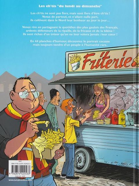 Les ch'tis "du lundi au dimanche". Les ch'tis ne sont pas fiers, mais sont fiers d'être ch'tis ! Venus de partout, et n'allant nulle part, ils cultivent dans le Nord leur bonheur au jour le jour... Venez rire en partageant le quotidien des plus gaulois des Français, ardents défenseurs de la ripaille, de la fricasse et de la bibine ! Ils sont riches d'un trésor qu'on ne leur volera jamais : leur coeur ! En 44 planches d'humour, découvrez le portrait cocasse mais toujours tendre d'un peuple à l'humanité rare.