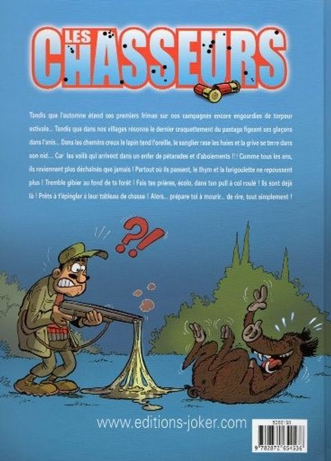 Tandis que l'automne étend ses premiers frimas sur nos campagnes encore engourdies de torpeur estivale... Tandis que dans nos villages résonne le dernier craquettement du pastaga figeant ses glaçons dans l'anis... Dans les chemins creux le lapin tend l'oreille, le sanglier rase les haies et la grive se terre dans son nid.... Car les voilà qui arrivent dans un enfer de pétarades et d'aboiements ! ! ! Comme tous les ans, ils reviennent plus déchaînés que jamais ! Partout où ils passent, le thym et la farigoulette ne repoussent plus ! Tremble gibier au fond de ta forêt ! Fais tes prières, écolo, dans ton pull à col roulé ! Ils sont déjà là ! Prêts à t'épingler à leur tableau de chasse ! Alors... Prépare toi à mourir.., de rire, tout simplement !