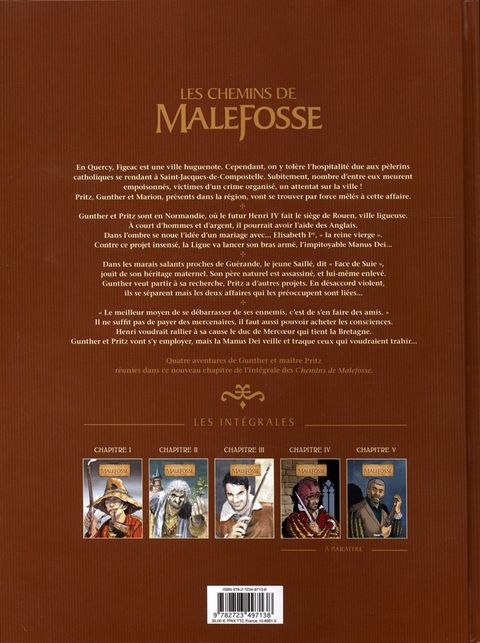 Henri de Navarre a besoin d'hommes d'armes pour conquérir le royaume et devenir Henri IV. Afin de résister aux différents complots suscités par la haine ou la jalousie qui pourraient peser contre lui, il s'offre les services de deux mercenaires allemands...Dans Les Chemins de Malefosse, Dermaut et Bardet ont recréé la France du XVIe siècle avec un sens de la reconstitution confondant et une langue savoureuse. L'esprit de cette époque y est retranscrit avec réalisme et brio. Un incontournable de la collection Vécu, dont les tomes 9 à 12 sont ici réunis en intégrale grand format.