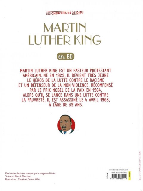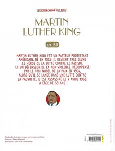 Martin Luther King est un pasteur protestant américain. Né en 1929, il devient très jeune le héros de la lutte contre le racisme et un défenseur de la non-violence. Récompensé par le prix Nobel de la paix en 1964, il se met à se battre aussi contre la pauvreté. Mais il est assassiné le 4 avril 1968. Il n'a que 39 ans.