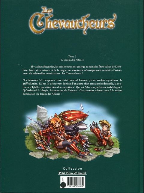 Il y a deux décennies, les armontures ont émergé au sein des États Alliés de Dombrée. Fruits de la science et de la magie, ces montures mécaniques ont conduit à l'avènement de redoutables combattants : les Chevaucheurs ! Nos héros ont été transportés dans la cité du nord, Icerune par un artefact mystérieux : La griffe d'Arian. Là-bas ils découvrent la piste d'un autre objet tout aussi redoutable, la Couronne d'Iphélis, qui attire bien des convoitises ! Qui est Ada, la mystérieuse archéologue ? Qu'arrive-t-il à Harpie, l'armonture de Phénice ? Ces chemins mènent tous à la même destination : Le Jardin des Alfanes !