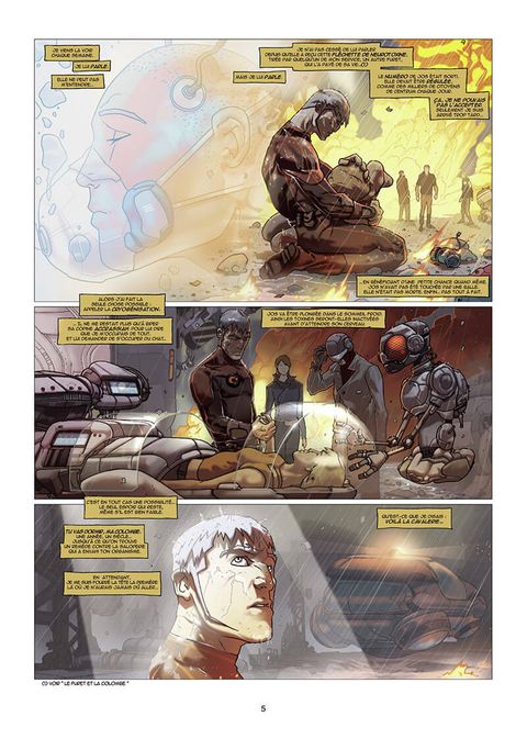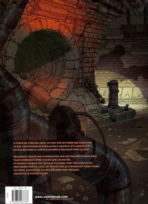 LES CHRONIQUES DE CENTRUM, UNE FIN DE CYCLE HALETANTE, SCÉNARISÉE PAR J.P. ANDREVON D'APRÈS SON ROMAN, LE TRAVAIL DU FURET..., ET SUPERBEMENT MISE EN RELIEF PAR A. KHALED ! Gigantesque mégapole, Centrum souffre de surpopulation. Chaque année, 400 000 citoyens sont tirés au sort pour être exécutés par un corps de police spéciale appelé les Furets. Parmi eux, un homme sans nom, au lourd passé, s'interroge... Le tirage au sort serait-il truqué ? Il décide de mener son enquête... Mais un jour, son amie Jos est tuée... Enragé, le Furet n'a plus qu'un seul but, une seule cible : O'Neill, son supérieur hiérarchique tapi dans les entrailles surprotégées du Ministère de la Population. Traqué à son tour, le Furet va s'enfoncer, en aveugle, dans les souterrains de Centrum, semant des monceaux de cadavres derrière lui, jusqu'au moment où son patron va se retrouver devant lui...