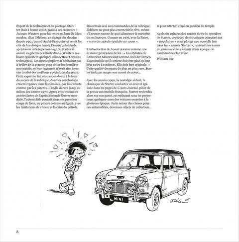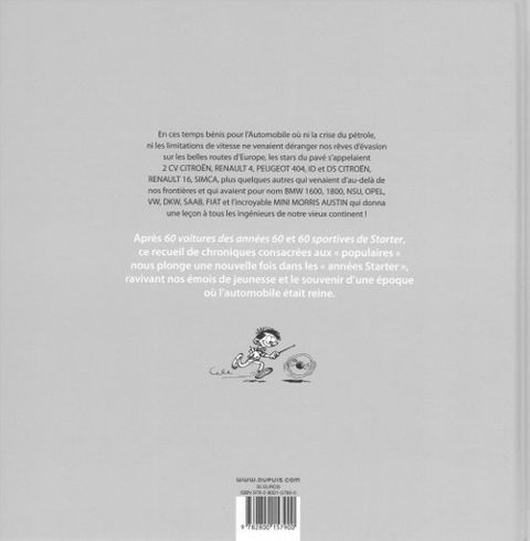 Dans les années 60, Starter donnait chaque semaine rendez-vous aux lecteurs du Journal de Spirou. Grand connaisseur des dernières nouveautés de l'industrie automobile, parfois intransigeant, souvent enthousiaste, il faisait partager aux petits comme aux grands son amour des belles mécaniques. Les voitures de sport ne furent pas oubliées au fil de ses commentaires parfois intransigeants, toujours enthousiastes. Né sous le pinceau de Jidéhem en 1957, le petit personnage Starter emprunta sa voix au chroniqueur Jacques Wauters, en décortiquant pour les lecteurs du Journal de Spirou les avantages et les inconvénients des autos de l'époque, lesquelles rivalisaient de prouesses techniques et d'audaces esthétiques. Après 60 voitures des années 60, ce sont les chroniques consacrées aux voitures sportives qui sont ici rassemblées. On y retrouve la verve et l'entrain légendaire de Starter, et les fameuses illustrations de Jidéhem, passé maître pour raconter, en quelques coups de crayon précis, toute la magie de ces voitures étonnantes.