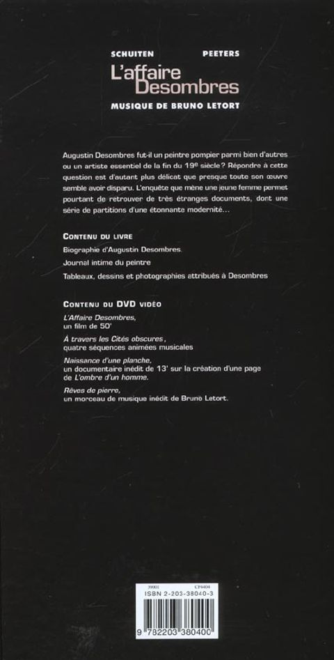 Augustin Desombres fut-il un peintre pompier parmi bien d'autres ou un artiste essentiel de la fin du 19e siècle ? Répondre à cette question est d'autant plus délicat que presque toute son oeuvre semble avoir disparu. L'enquête que mène une jeune femme permet pourtant de retrouver de très étranges documents, dont une série de partitions d'une étonnante modernité... Contenu du livre Biographie d'Augustin Desombres. Journal intime du peintre Tableaux, dessins et photographies attribués à Desombres Contenu du DVD vidéo L'Affaire Desombres, un film de 50' A travers les Cités obscures, quatre séquences animées musicales Naissance d'une planche, un documentaire inédit de 13' sur la création d'une page de L'ombre d'un homme. Rêves de pierre, un morceau de musique inédit de Bruno Letort.
