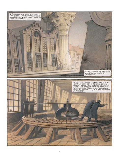 Aimé, un enfant d'une dizaine d'années au crâne rasé, vit à Taxandria, une ville en ruines, emplie de colonnes corinthiennes et de grands palais déserts. Suite à un mystérieux cataclysme, les lois de " L'Éternel Présent " ont été promulguées à Taxandria : toute allusion au passé et au futur y a été interdite, toutes les machines ont été bannies. Aimé découvre un livre d'images qui relate ces terribles évènements. Il est bouleversé par cette lecture et plus rien ne peut désormais l'arrêter. Parviendra-t-il à échapper à l'empire sinistre du monde de l'Éternel Présent ? Le chantier de réédition de la passionnante saga des Cités obscures se poursuit avec cet album épuisé depuis plusieurs années. Ce livre est né de la rencontre des auteurs avec le pionnier belge du cinéma d'animation Raoul Servais, alors qu'il préparait son long-métrage Taxandria, film expérimental baigné dans le surréalisme belge, et inspiré par les oeuvres de Magritte et Delvaux.