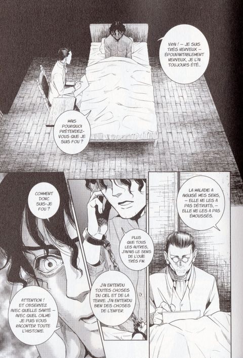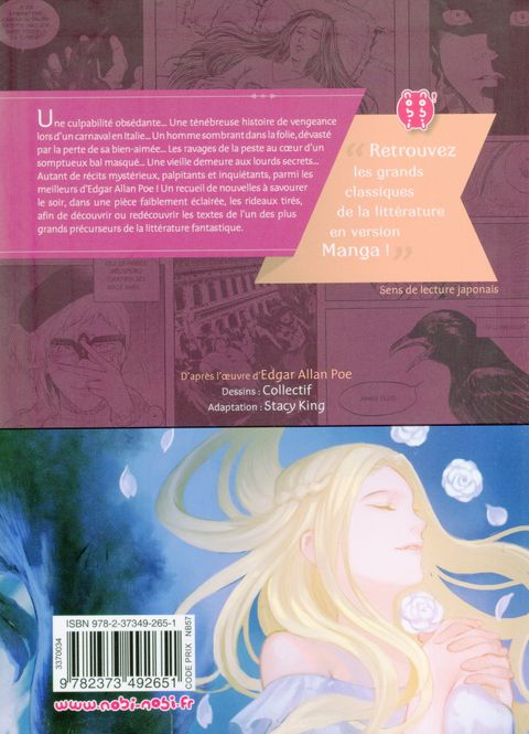 Une culpabilité obsédante... Une sombre histoire de vengeance... Un amoureux qui tombe dans la folie... Les horreurs de la peste... Une étrange maison aux lourds secrets... Autant de récits mystérieux, palpitants et inquiétants, parmi les meilleurs d'Edgar Allan Poe, l'un des plus grands précurseurs de la littérature fantastique. Un recueil de nouvelles à lire le soir, dans une pièce faiblement éclairée, les rideaux tirés, pour frissonner de plaisir ! Inclus dans ce manga : Le Coeur révélateur, La Barrique d'amontillado, Le Masque de la mort, La Chute de la maison Usher et le poème Le Corbeau.