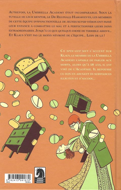 Autrefois, la Umbrella Academy était incomparable. Sous la tutelle de leur mentor, le Dr Reginald Hargreeves, cette équipe dysfonctionnelle de jeunes super-héros a passé son enfance à combattre le mal et à perfectionner ses dons extraordinaires. Jusqu'à ce que quelque chose de terrible arrive... Et Klaus n'est pas le moins névrosé de l'équipe... Loin de là !