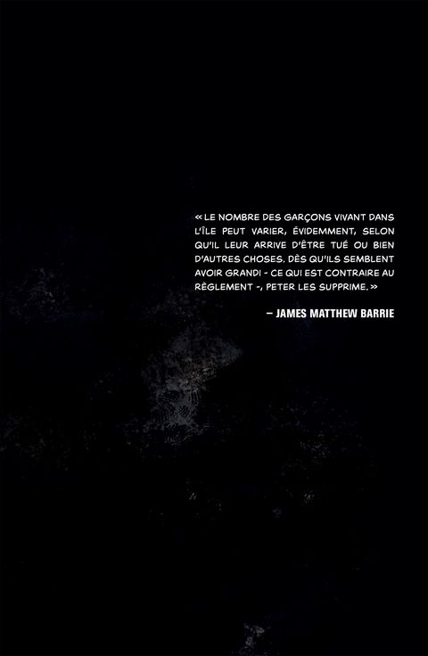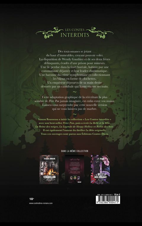 La réécriture la plus sombre du conte classique Peter Pan jamais imaginée, entre vos mains. Oserez-vous plonger dans la version graphique de ce Conte interdit ? Une vague de drogués se jetant du haut d'immeubles, croyant pouvoir voler. La disparition d'une jeune femme, Wendy Gauthier, et de ses deux frères délinquants, évadés de leur pénitencier pour mineurs. Une île perdue dans la forêt boréale, habitée par une communauté déjantée et leur leader sans âge. Une baronne du crime nymphomane et amoureuse des bijoux en forme de clochettttes. Un enquêteur médisant dépourvu de sa main droite, dévorée par un cannibale qui hante encore ses nuits.