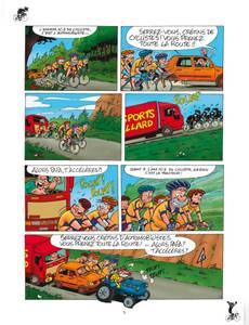 Nico, Chris, Doumé et Alain ont décidé de faire du sport. Et pas n'importe lequel, le plus noble d'entre eux : le cyclisme. Finies les petites balades du dimanche après-midi, les quatre amis se sont inscrits dans un club local pour devenir de véritables grimpeurs et sprinteurs. Et selon les brochures, cette association est dirigée par un champion de la petite reine. Cependant la dernière victoire du président date de 1957 et certains adhérents sont perclus de rhumatismes !! Néanmoins, ces vétérans du Tour de France, malgré leur grand âge, ont bien des choses à apprendre à ces petits jeunes qui comptent (trop) sur les performances de leur matériel. Ainsi, de pelotons en balades bucoliques, de crevaisons en échappées, la fine équipe, bientôt rejointe par Candice, va faire de gros progrès. Dans chaque gag des Cyclistes, on sent le vécu ! Les anecdotes sont savoureuses et le comique de situation fera rire même ceux qui n'ont jamais touché à un vélo.