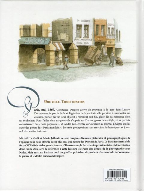 Paris, mai 1869. Constance Desprez arrive de province à la gare Saint-Lazare. Décontenancée par la foule et l’agitation de la capitale, elle parvient à surmonter ses craintes, portée par un seul objectif : retrouver son fils, placé dès sa naissance dans un orphelinat. Pour l’aider dans sa quête, elle s’appuie sur Darius, gavroche espiègle, et sa parfaite connaissance du « Paris populaire », et André Gill, célèbre caricaturiste au journal L’Éclipse qui lui ouvre les portes du « Paris mondain ». Les trois protagonistes sont en scène, le drame peut se jouer, nul n’en sortira indemne… Michaël Le Galli et Marie Jaffredo se sont inspirés d’œuvres picturales et photographiques de l’époque pour nous offrir le décor plus vrai que nature des Damnés de Paris. Le Paris fascinant de la fin du XIXe siècle et des grands travaux d’Haussmann ; le Paris des impressionnistes et des écrivains, dont Émile Zola sert de référence à cette histoire ; le Paris des débuts de la photographie avec Nadar. Mais aussi un Paris au bord du gouffre, précédant de peu les événements de la Commune, la guerre et le déclin du Second Empire.