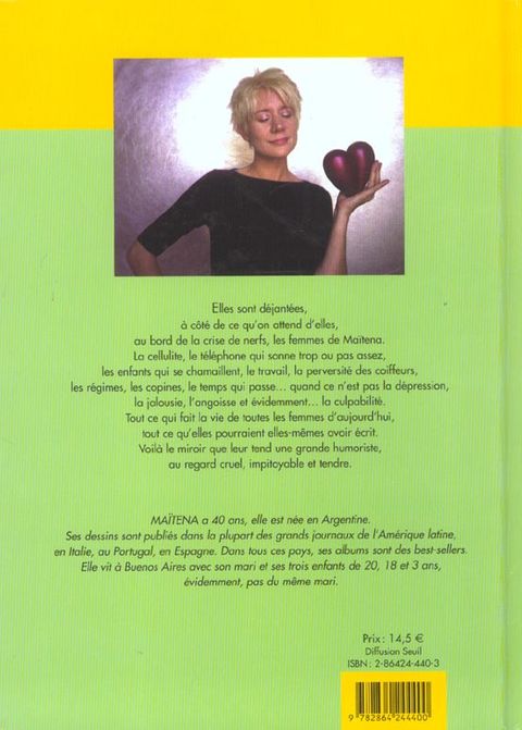 Elles sont déjantées, à côté de ce qu'on attend d'elles, au bord de la crise de nerfs, les femmes de Maïtena. La cellulite, le téléphone qui sonne trop ou pas assez, les enfants qui se chamaillent, le travail, la perversité des coiffeurs, les régimes, les copines, le temps qui passe... quand ce n'est pas la dépression, la jalousie, l'angoisse et évidemment... la culpabilité. Tout ce qui fait la vie de toutes les femmes d'aujourd'hui, tout ce qu'elles pourraient elles-mêmes avoir écrit. Voilà le miroir que leur tend une grande humoriste, au regard cruel, impitoyable et tendre.
