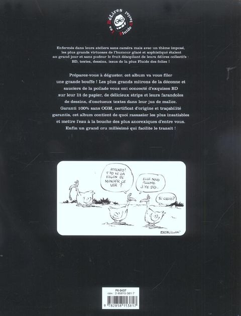 Enfermés dans leurs ateliers sans caméra mais avec un thème imposé, les plus grands virtuoses de l'humour glacé et sophistiqué étalent au grand jour et sans pudeur le fruit désopilant de leurs délires collectifs : BD, textes, dessins, issus de la plus Fluide des folies !Préparez-vous à déguster, cet album va vous filer une grande bouffe ! Les plus grands mitrons de la déconne et sauciers de la poilade vous ont concocté d'exquises BD sur leur lit de papier, de délicieux strips et leurs farandoles de dessins, d'onctueux textes dans leur jus de malice. Garanti 100 % sans OGM, certificat d'origine et traçabilité garantis, cet album contient de quoi rassasier les plus insatiables et mettre l'eau à la bouche des plus anorexiques d'entre vous. Enfin un grand cru millésimé qui facilite le transit !