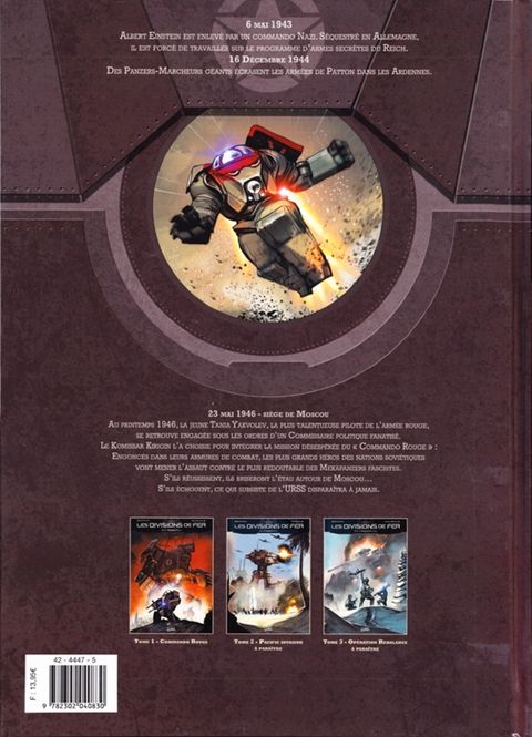 Les Divisions de fer est une nouvelle série uchronique guerrière mettant en scène des mécha panzers géants. Comment l'apparition d'une nouvelle technologie en 1944 va inverser le cours du second conflit mondial et entrainer les Allemands vers la victoire. « Commando Rouge » est l'album d'ouverture de la série des « Divisions de Fer » Sur le front Est, les dernières poches de résistances de l'Armée rouge tombent les unes après les autres. Pour sauver Moscou, le général Joukov réunit le Commando rouge. Engoncés dans leurs armures mécanisées et blindées, les plus grands héros de l'Armée rouge vont participer à une opération de la dernière chance : s'emparer du meilleur Mekapanzer Nazi et le retourner contre l'armée allemande. Mais au sein du Commando rouge, Joukov commet peut-être une erreur en incluant Nia, la fougueuse pilote idéaliste et un Komissar politique fanatisé au commandement brutal. Ils vont devoir apprendre à combattre côte à côte ou à mourir !