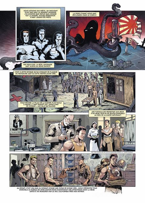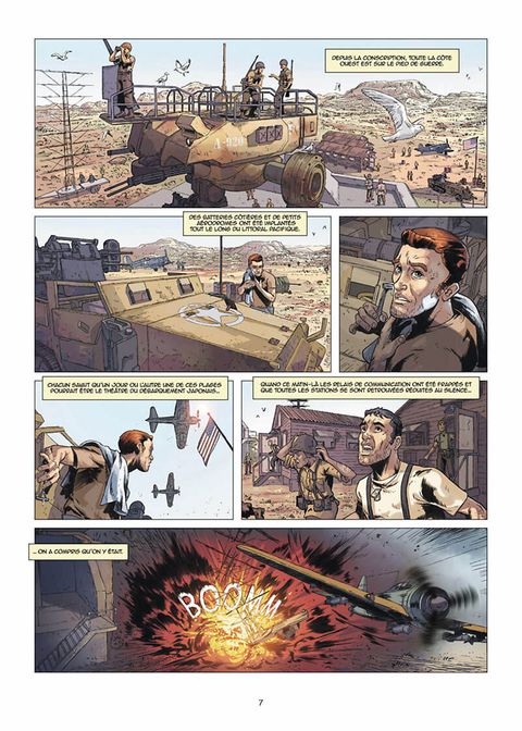 Et si des Mekapanzers, des Tanks marcheurs géants, avaient été créés en 1944, bouleversant à jamais le cours de la guerre ? 7 Mai 1948 : les forces japonaises débarquent sur les côtes californiennes ! Après la périlleuse mission soviétique du tome 1, juste avant la chute de Moscou, ce deuxième chapitre nous entraine sur le front pacifique, alors qu'une armada de mekas blindés japonais met à mal les lignes de défenses américaines. Jeunes recrues, Casey et ses amis ont grandi ensemble. La guerre les a extirpés du rêve californien, leur vie étant jusque-là partagée entre l'apprentissage d'un métier, les sorties en ville avec les filles et le pop-corn du cinéma El Camino. Recrutés pour la Coastal Home Guard, ils sont affectés à la surveillance des plages dans un bunker. Ils seront les premiers soldats américains à affronter les Blindés Marcheurs Géants de l'Empire Japonais.