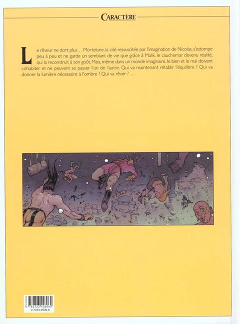 Le rêveur ne dort plus... Mortelune, la cité ressuscitée par l'imagination de Nicolas, s'estompe peu à peu et ne garde un peu de vie que grâce à Malik, le cauchemar devenu réalité, qui la reconstruit à son goût. Mais même dans un monde imaginaire le bien et le mal doivent cohabiter et ne peuvent se passer l'un de l'autre. Qui va maintenant rétablir l'équilibre ? Qui va donner la lumière nécessaire à l'ombre ? Qui va rêver ? Ce second cycle des Eaux de Mortelune danse avec élégance sur les frontières de l'imagination et de la science-fiction. Patrick Cothias jongle avec la poésie et la violence quand Philippe Adamov, au sommet de son art, exploite toute la puissance de son superbe dessin.