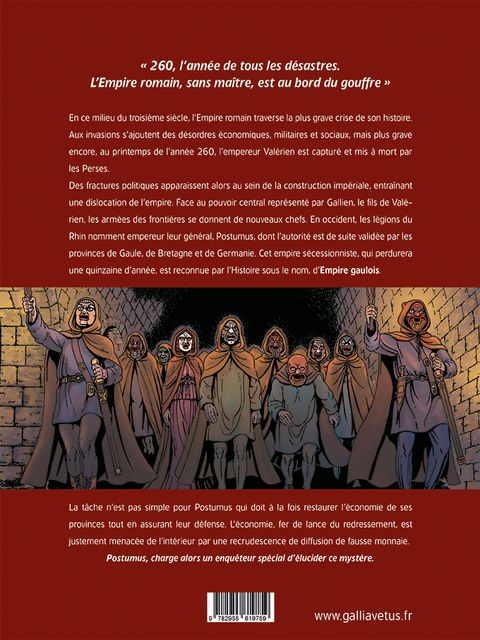 260, l'année de tous les désastres. En ce milieu du troisième siècle, l'Empire romain traverse la plus grave crise de son histoire. Aux invasions s'ajoutent des désordres économiques, militaires et sociaux, mais plus grave encore, au printemps de l'année 260, l'empereur Valérien est capturé et mis à mort par les Perses. Des fractures politiques apparaissent alors au sein de la construction impériale, entraînant une dislocation de l'empire. En occident, les légions du Rhin nomment empereur leur général, Postumus, dont l'autorité est de suite validée par des provinces. Cet empire sécessionniste, qui perdurera quinze années, est reconnue par l'Histoire sous le nom, d' Empire gaulois. La tâche n'est pas simple pour Postumus qui doit à la fois restaurer l'économie de ses provinces tout en assurant leur défense.L'économie, fer de lance du redressement, est menacée de l'intérieur par une recrudescence de fausse monnaie. Postumus, charge alors un enquêteur spécial d'élucider ce mystère.