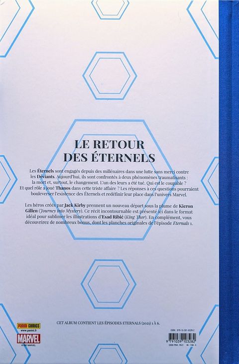 Une nouvelle ère commence pour les plus anciens super-êtres de la planète. Bien avant les Avengers, bien avant que les humains n'apprennent à se tenir debout, Ikaris, Circé, Thena et les autres Eternels étaient déjà là, avec pour principale mission de protéger la Grande Machine que nous appelons la Terre. Mais aujourd'hui, quelqu'un tue les Eternels et la Machine ne parvient plus à les ressusciter ! Thanos est de retour, mais il n'agit pas seul. Y aurait-il un traître parmi les Eternels ? Kieron Gillen, le formidable auteur de Die, Dark Vador et Loki : Journey Into Mystery, est de retour chez Marvel pour prendre en main l'équipe qui envahira les salles de cinéma en novembre, dans un film réalisé par Chloé Zhao, lauréate de l'Oscar de la Meilleure Réalisatrice pour Nomadland. C'est Esad Ribic (Secret Wars, Thor : Le Massacreur de Dieux) qui l'accompagne. Très certainement l'un des chocs de la fin d'année. Contient les épisodes US de Eternals (2021) #1-6.