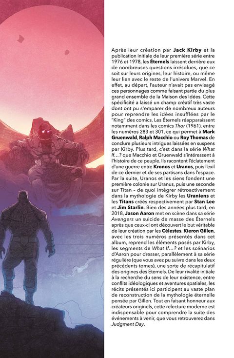 Les deux premiers volumes de la série ne vous ont pas dévoilé tous les secrets des Éternels ! Nous suivons Thanos lorsqu'il était le chef de la race d'immortels et découvrons qu'il n'a pas été le pire leader des Éternels ! Qui est Uranos et pourquoi ne faut-il surtout pas qu'il soit libéré ? L'occasion également de revenir sur les origines du Titan Fou, et de s'intéresser à deux personnages qui évoluent en marge de leurs semblables : Ajak et Makkari. Kieron Gillen est l'architecte de la nouvelle série Eternals qui a surpris par les énormes rebondissements qu'elle réserve à ses lecteurs. Il sera également aux commandes d'un crossover d'une ampleur inégalée impliquant Avengers, X-Men et Éternels : Judgment Day, à suivre très bientôt. Vous retrouverez ici les trois numéros spéciaux qu'il a scénarisé en marge de la série régulière, et qui lèvent le voile sur certains détails laissés jusque-là dans l'ombre. Contient les épisodes US : • Eternals: Thanos Rises (2021) #1, • Eternals: Celestia (2021) #1, • Eternals: The Heretic (2022) #1, • Des extraits de What If (1977) #24-28.