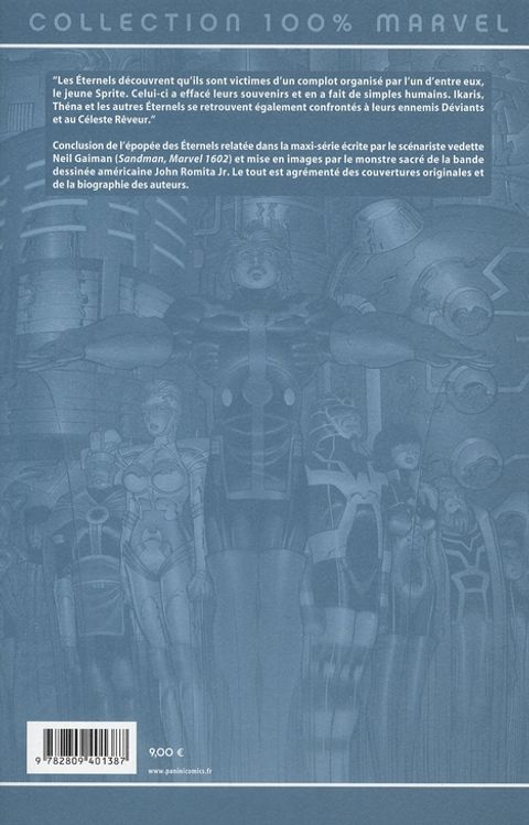 "Les Eternels découvrent qu'ils sont victimes d'un complot organisé par l'un d'entre eux, le jeune Sprite. Celui-ci a effacé leurs souvenirs et en a fait de simples humains. Ikaris, Théna et les autres Eternels se retrouvent également confrontés à leurs ennemis Déviants et au Céleste Rêveur." Conclusion de l'épopée des Eternels relatée dans la maxi-série écrite par le scénariste vedette Neil Gaiman (Sandman, Marvel 1602) et mise en images par le monstre sacré de la bande dessinée américaine John Romita Jr. Le tout est agrémenté des couvertures originales et de la biographie des auteurs.