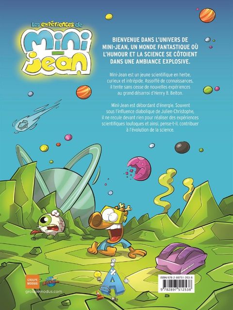Bienvenue dans l'univers de Mini-Jean, un monde fantastique où l'humour et la science se côtoient dans une ambiance explosive ! Mini-Jean est un jeune scientifique en herbe,curieux et intrépide. Assoiffé de connaissances, il tente sans cesse de nouvelles expériences au grand désarroi d'Henry B. Belton. Mini-Jean est débordant d'énergie. Souvent sous l'influence diabolique de Julien-Christophe, il ne recule devant rien pour réaliser des expériences scientifiques loufoques et ainsi, pense-t-il, contribuer à l'évolution de la science. - Personnage principal : Mini-Jean, un clone de L'Agent Jean. - Les expériences de Mini-Jean : série de bandes dessinées développée par Alex A., le créateur de L'Agent Jean. - Bande dessinée de format classique avec couverture rigide. - Histoires courtes idéales pour les jeunes lecteurs.
