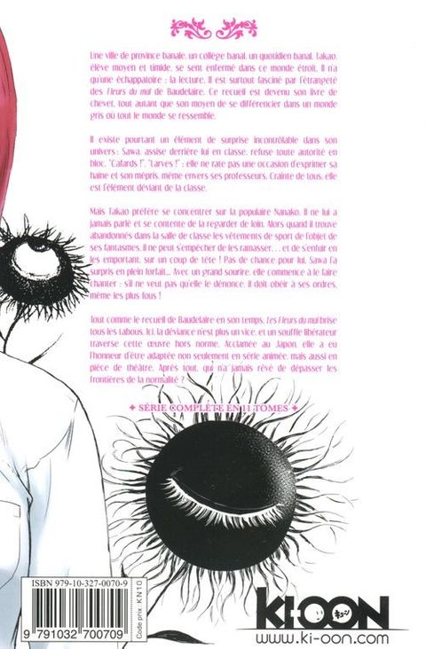 Une ville de province banale, un collège banal, un quotidien banal. Takao, élève moyen et timide, se sent enfermé dans ce monde étroit. Il n'a qu'une échappatoire : la lecture. Il est surtout fasciné par l'étrangeté des Fleurs du mal de Baudelaire. Ce recueil est devenu son livre de chevet, tout autant que son moyen de se différencier dans un monde gris où tout le monde se ressemble. Il existe pourtant un élément de surprise incontrôlable dans son univers : Sawa, assise derrière lui en classe, refuse toute autorité en bloc. «Cafards !», «Larves !» : elle ne rate pas une occasion d'exprimer sa haine et son mépris, même envers ses professeurs. Crainte de tous, elle est l'élément déviant de la classe. Mais Takao préfère se concentrer sur la populaire Nanako. Il ne lui a jamais parlé et se contente de la regarder de loin. Alors quand il trouve abandonnés dans la salle de classe les vêtements de sport de l'objet de ses fantasmes, il ne peut s'empêcher de les ramasser... et de s'enfuir en les emportant, sur un coup de tête ! Pas de chance pour lui, Sawa l'a surpris en plein forfait... Avec un grand sourire, elle commence à le faire chanter : s'il ne veut pas qu'elle le dénonce, il doit obéir à ses ordres, même les plus fous ! Tout comme le recueil de Baudelaire en son temps, Les Fleurs du mal brise tous les tabous. Ici, la déviance n'est plus un vice, et un souffle libérateur traverse cette oeuvre hors norme. Acclamée au Japon, elle a eu l'honneur d'être adaptée non seulement en série animée, mais aussi en pièce de théâtre. Après tout, qui n'a jamais rêvé de dépasser les frontières de la normalité ?