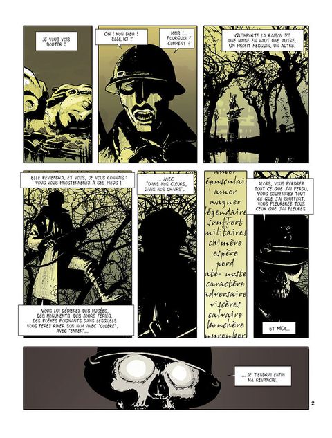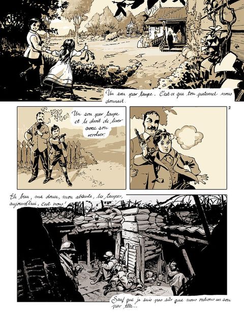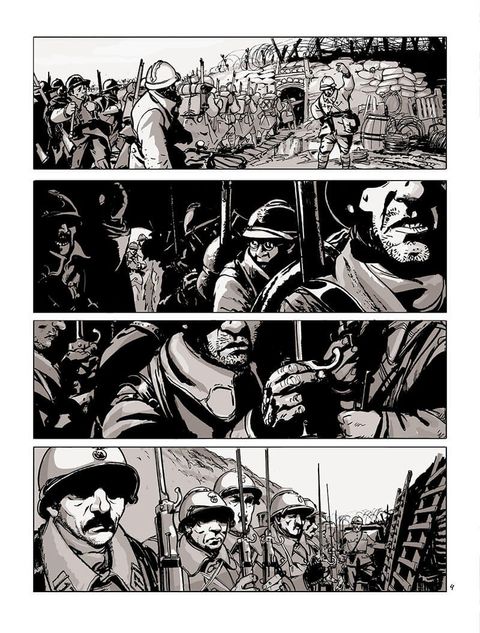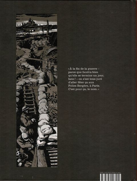 La guerre 14-18. Les tranchées. Des soldats sont confrontés à la souffrance et à la mort. Considérés comme de la chair à canon par leurs chefs, ils tentent de survivre. La guerre 14-18. Pour défier la mort, les soldats appellent leur compagnie "Les Folies Bergère" et se donnent à chacun un surnom. Dans les tranchées, ils se serrent les coudes. Plaisantent. Dessinent. Gardent espoir. Et se battent. Meurent dans d'atroces souffrances. Se suicident ou perdent la raison. L'un d'eux est condamné au peloton d'exécution et... en réchappe. C'est un miracle. Jusqu'à ce qu'on lui amène sa fillette égarée sur les terres de personne. Le propos est désespéré et les personnages sont tragiques, attachants. Les dialogues vont à l'os et le dessin, réaliste, est très éloquent.