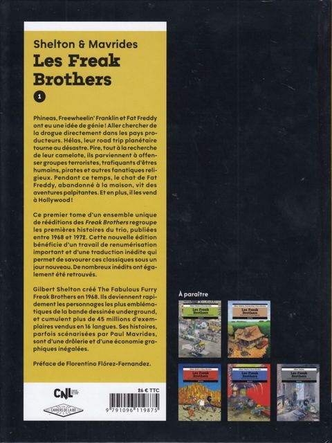 Créés en 1968 par Gilbert Shelton, largement reconnu comme l’un des dessinateurs les plus drôles de tous les temps, les escapades rocambolesques et hilarantes des Freak Brothers sont des chefs-d’œuvre de farce et de satire. Dans cet épisode, la première et la plus longue des aventures des Freak Brothers, nos trois pied nickelés hippies, Phineas, Freewheelin’ Franklin et Fat Freddy partent avec de grands espoirs pour la Colombie, mais (comme toujours !) leurs plans tournent mal de la façon la plus hilarante et la plus autodestructrice qui soit. Éparpillés aux quatre coins du monde – en Écosse, en Russie, en Afrique, en Amérique du Sud et au Moyen-Orient – ils parviennent à contrarier, à offenser et à agacer divers groupes de terroristes nucléaires, de trafiquants d’êtres humains, de pirates et de fanatiques religieux. Pendant ce temps, le Fat Freddy’s Cat, abandonné à la maison, a non seulement sa propre aventure, mais il vend même l’histoire à Hollywood !