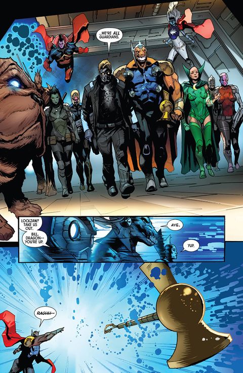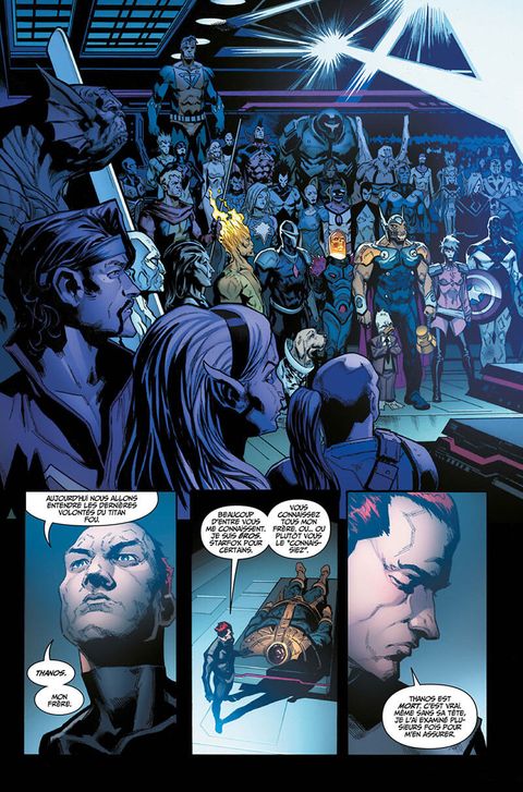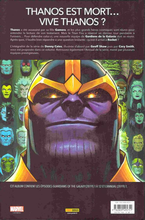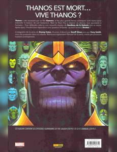 Au lendemain d'Infinity Wars, Thanos est mort, Gamora est en fuite, Rocket a disparu et les Gardiens de la Galaxie sont pour l'essentiel séparés. Les plus grands personnages cosmiques de l'univers Marvel se réunissent pour la lecture du testament du Titan Fou, mais rien ne va se passer comme prévu. Quel dernier tour maléfique Thanos a-t-il dans son sac ? Et quels nouveaux Gardiens de la Galaxie vont surgir du chaos ? En 2017, Donny Cates et Geoff Shaw explosent sur le devant de la scène comics avec Thanos gagne, une épopée futuriste consacrée au Titan fou, également la première apparition du Ghost Rider cosmique. Cates et Shaw se réunissent pour une série en deux tomes consacrée aux Gardiens, précédant chronologiquement la nouvelle série qui paraît également ce mois. L'album sert également de prologue à Silver Surfer : Black, paru en début d'année dernière.