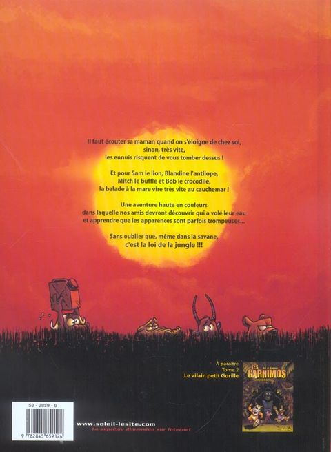 Au coeur de la savane, Sam et sa bande de joyeux acolytes, Blandine, Mitch et Bob passent leur temps à s'amuser... et à essayer de se manger ! Mais un beau jour, leurs parents les envoient chercher de l'eau à la mare, et tout se précipite ! Les voilà investis d'une enquête périlleuse qui les conduira jusque dans la brousse, à la poursuite d'un voleur... Enfin, s'ils parviennent à ne pas s'entre-dévorer avant ! Et oui, même dans la savane, c'est la loi de la jungle !