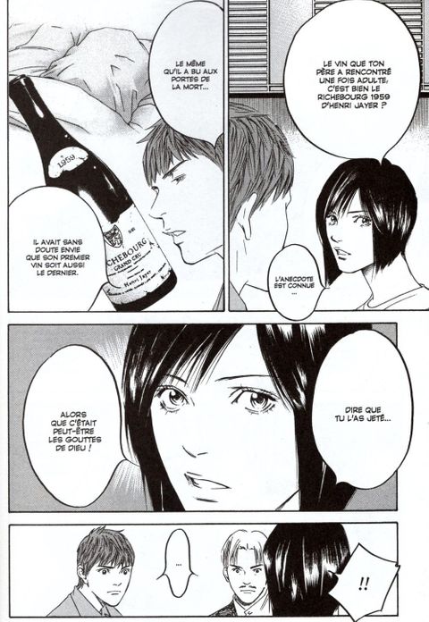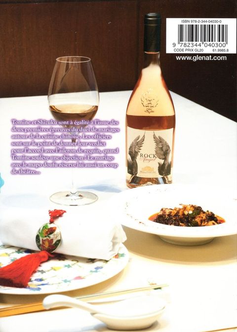 Tomine et Shizuku sont à égalité à l'issue des deux premières épreuves du duel de mariages autour de la cuisine chinoise. Les officiers sont sur le point de donner leur verdict pour l'accord avec l'aileron de requin, quand Tomine soulève une objection! Le mariage avec le mapo doufu réserve lui aussi un coup de théâtre...Le vainqueur désigné, les deux candidats reçoivent chacun leurs feuillets de l'article. La véritable quête des Gouttes de Dieu peut enfin commencer!