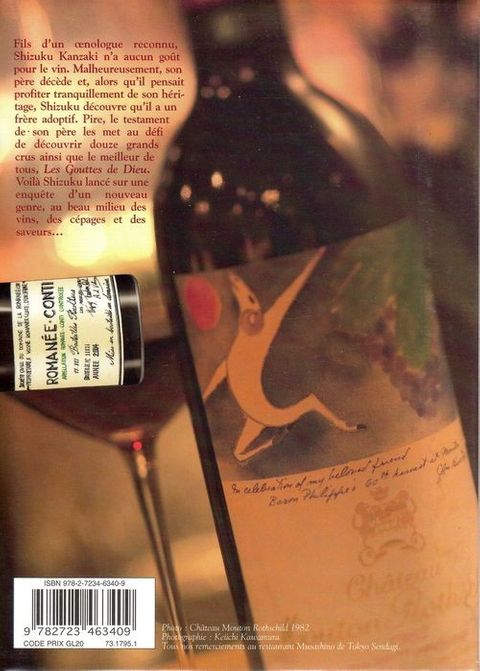 Lorsque le prestigieux oenologue Yutaka Kanzaki décède, son testament est clair : son extraordinaire cave reviendra à celui de ses deux fils qui résoudra 12 énigmes concernant 12 vins. Il découvrira alors un 13e et mystérieux vin, inconnu de tous, surnommé « Les Gouttes de Dieu ». Une chasse au trésor sous forme d'enquête policière va confronter les deux frères aux caractères et parcours opposés... Mystères et investigations se succèdent autour des crus les plus prestigieux, pour les deux frères ennemis qui se livrent à une véritable course-poursuite. Au travers de cette affrontement, le scénario conduit le lecteur dans une découverte de l'univers du vin, son langage, ses particularités, ses traditions.