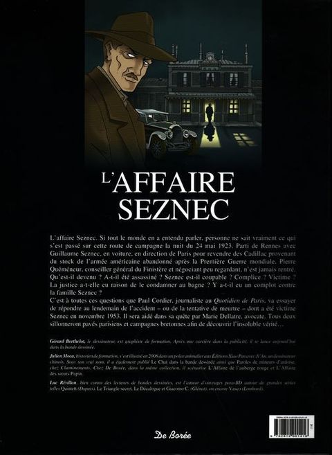 L'aff aire Seznec. Si tout le monde en a entendu parler, personne ne sait vraiment ce qui s'est passé sur cette route mystérieuse de campagne, la nuit du 24 mai 1923. D'ailleurs, il faudrait plutôt parler d'aff aire Quéméneur-Seznec. Parti de Bretagne avec Seznec, en voiture, en direction de Paris afi n d'aller vendre des Cadillac provenant du surplus du stock de l'armée américaine datant de la Première Guerre mondiale, Quéméneur, conseiller général et homme d'aff aires peu regardant, n'est jamais rentré. Qu'est-il devenu ? A-t-il été assassiné ? Seznec est-il coupable ? Ou victime ? La justice a-t-elle eu raison de le condamner au bagne ? Y a-t-il un complot contre la famille Seznec ? C'est à toutes ces questions que Paul Cordier, journaliste au Quotidien de Paris, va tenter de répondre au lendemain de l'accident - ou de la tentative de meurtre - dont a été victime Guillaume Seznec, en novembre 1953. Il sera aidé dans sa quête par Marie Dellatre, avocate. Tous deux sillonneront les pavés parisiens, les campagnes bretonnes et le port du Havre, afi n de découvrir la vérité...